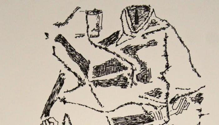 The wide smile of the performer is made ludicrous by his nudity. His walk backwards on his hands and feet likewise looks slapstick, a parody of the seriousness of modern life. Chowdhury characters such as these are fascinating as they are rarely placed in a distinct surrounding. It is as if they could be everywhere and anywhere in our world. Works such as this seemingly ridiculing our human drama have a dark core inspired by the traumatic experiences of partition, dislocation and isolation.
