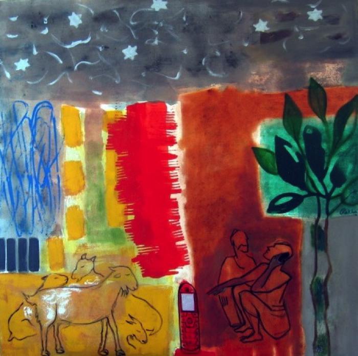 Modern India is encapsulated in this magical painting by Rao. A shepherd looks after his goats whilst making a deal with another phone far away...