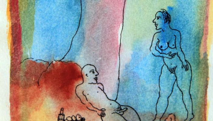The wide smile of the performer is made ludicrous by his nudity. His walk backwards on his hands and feet likewise looks slapstick, a parody of the seriousness of modern life. Chowdhury characters such as these are fascinating as they are rarely placed in a distinct surrounding. It is as if they could be everywhere and anywhere in our world. Works such as this seemingly ridiculing our human drama have a dark core inspired by the traumatic experiences of partition, dislocation and isolation.